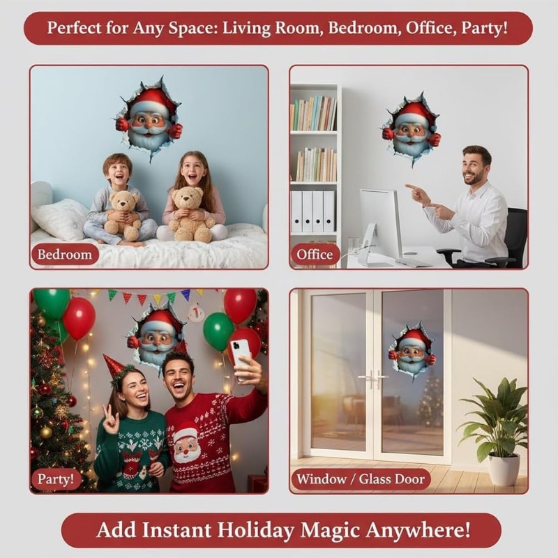 From living rooms and bedrooms to home offices and entryways, these 3D Santa decals spread Christmas cheer in any indoor space. Use them on walls, windows, glass doors, cabinets or even refrigerators to create a fun holiday focal point. They are also perfect for shops, classrooms and party venues, adding a festive touch without permanent changes.