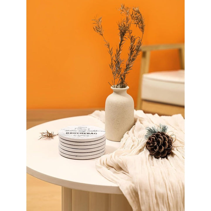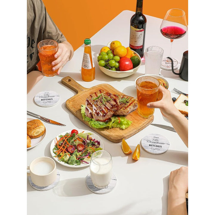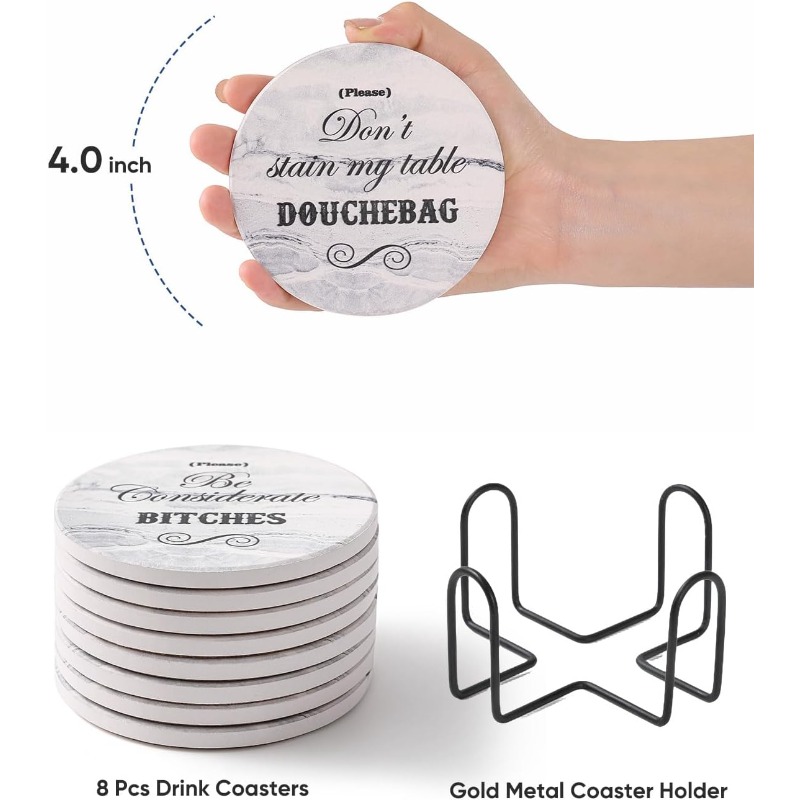 Let your guests laugh every time they lift their cup! This 8-piece coaster set features four hilarious quotes that make everyone smile while keeping your tabletop spotless. Each coaster measures 4 inches in diameter — perfect for wine glasses, mugs, or beer bottles.