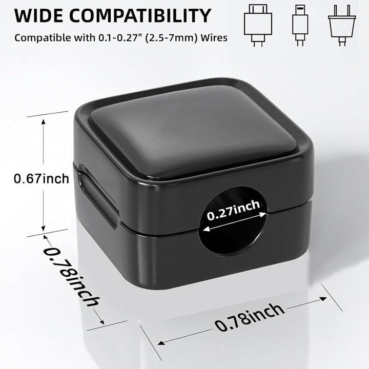 Compatible with cables 0.1"–0.27" (2.5–7mm), including USB-C, Lightning, USB-A, HDMI, headphone cables, and more.