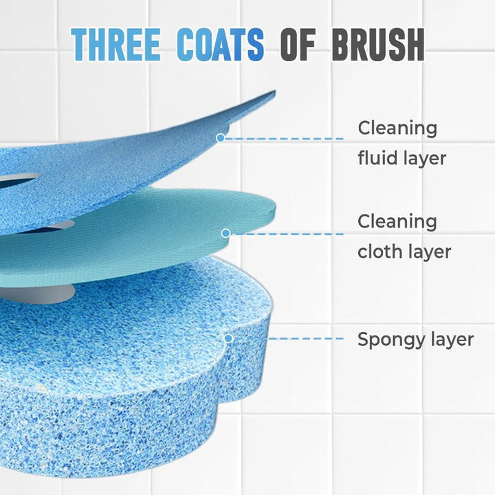 The disposable head features a spongy cushion layer for conforming contact, a durable cleaning cloth layer for friction, and a cleaning-fluid layer that dissolves grime and deodorizes as you scrub.